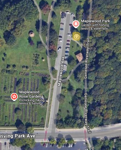 We will meet in Maplewood Park at the Kelsey’s Landing sign between the two Genesee Riverway Trail signs. All 3 signs are located near the office building in the park on the opposite side to the Rose garden (scroll to bottom of the screen to see an image with the location highlighted).